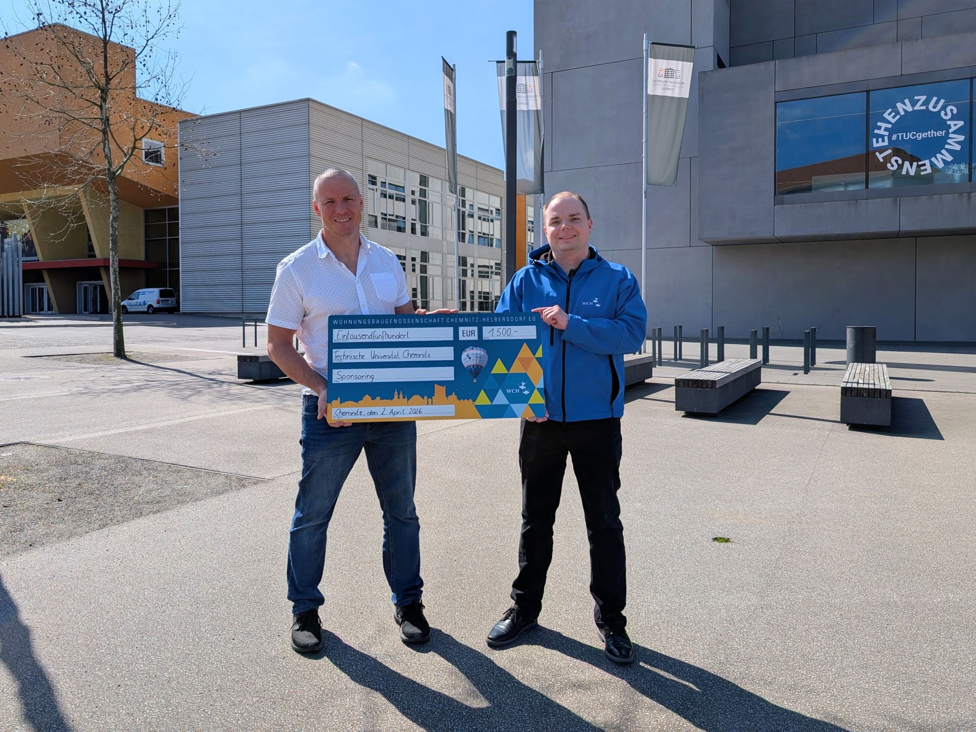 Wir freuen uns, die TU Chemnitz mit einem Sponsoring in Höhe von 1.500 € zu unterstützen. Im Rahmen der Übergabe überreichte unser stellv. Abteilungsleiter Vermietung/Marketing Patrick Fanghänel den Scheck an Marc Stoll vom Career Service der TU Chemnitz.